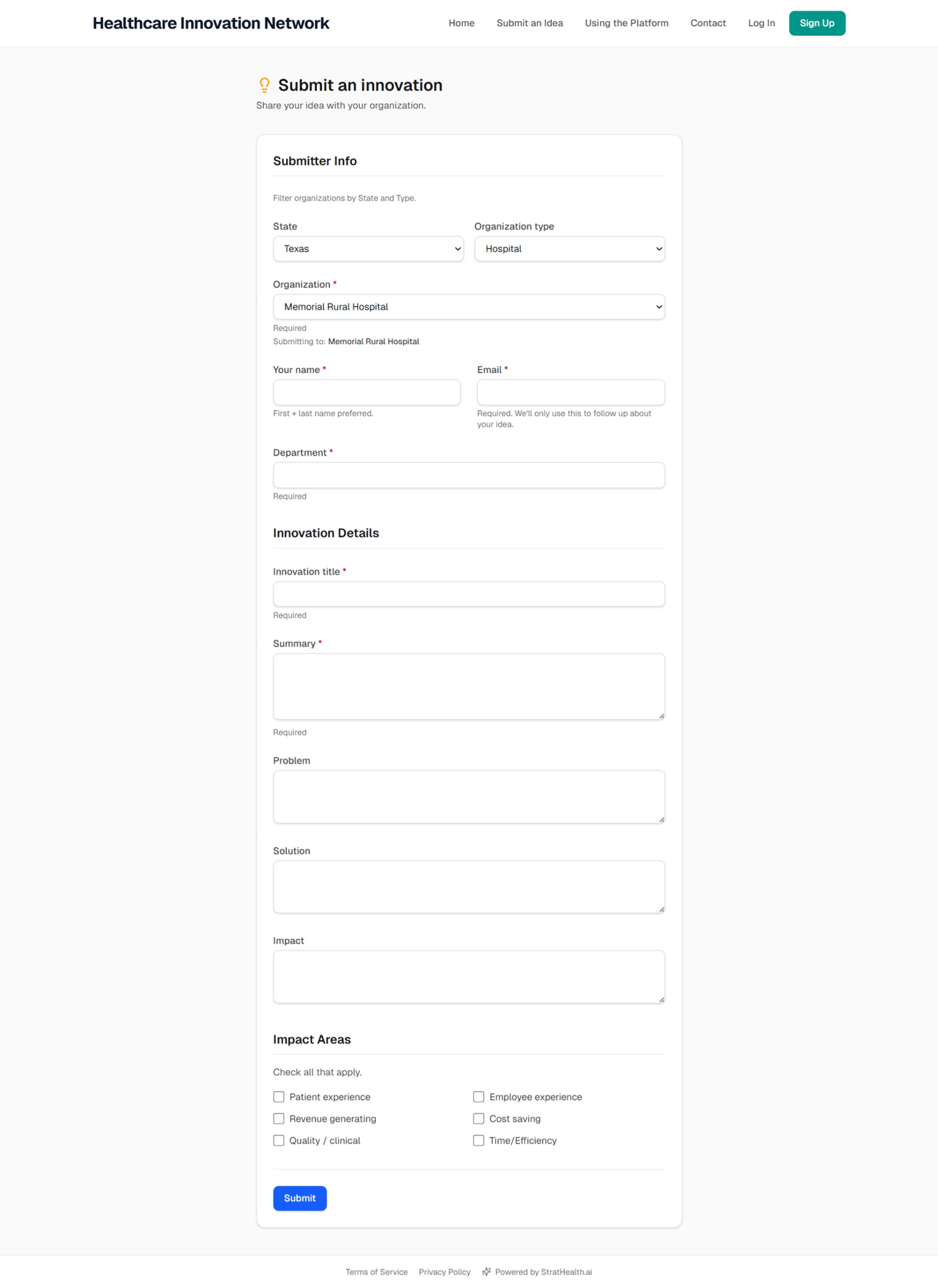 Share your organization's submission link with employees or direct them to innovate.strathealth.ai to submit ideas.